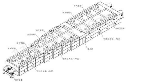 在橫拉設(shè)備中烘箱主要為薄膜預(yù)熱、拉伸、定型、冷卻過程中提供一個(gè)密閉保溫的空間,并且烘箱內(nèi)部按區(qū)域功能及一定間距為由隔斷板間隔開。